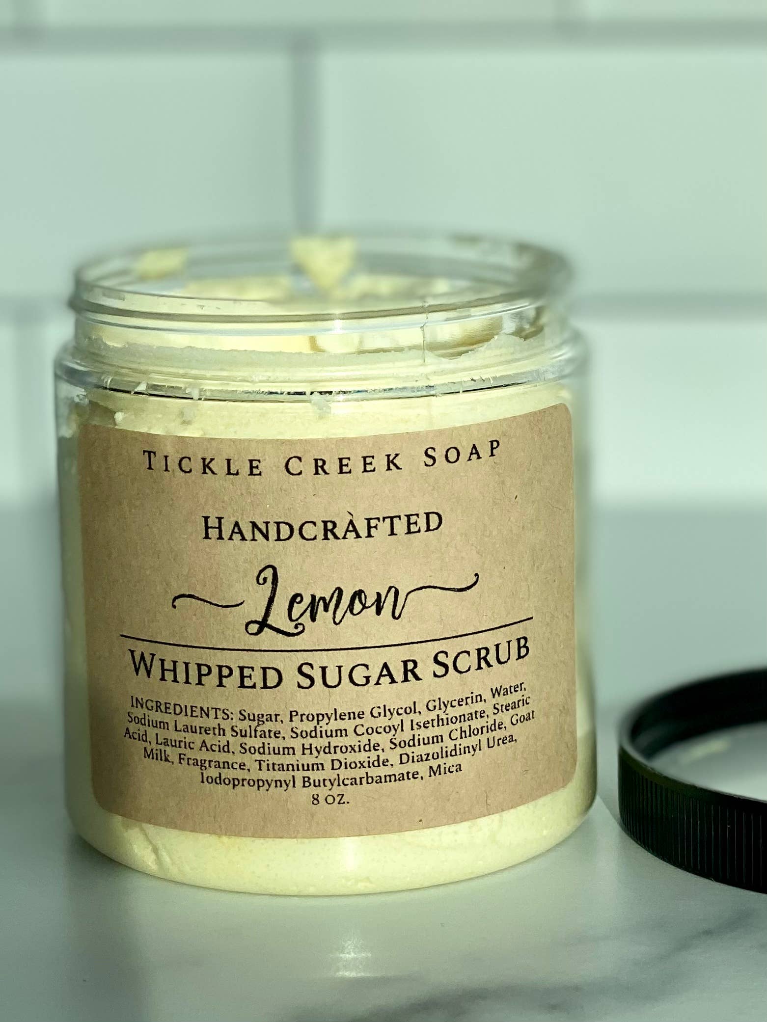 This whipped sugar scrub soap in Lemon will exfoliate, cleanse, and moisturize all at the same time! It has a fresh clean lemon scent with hints of bergamot, musk, and bright citrus.